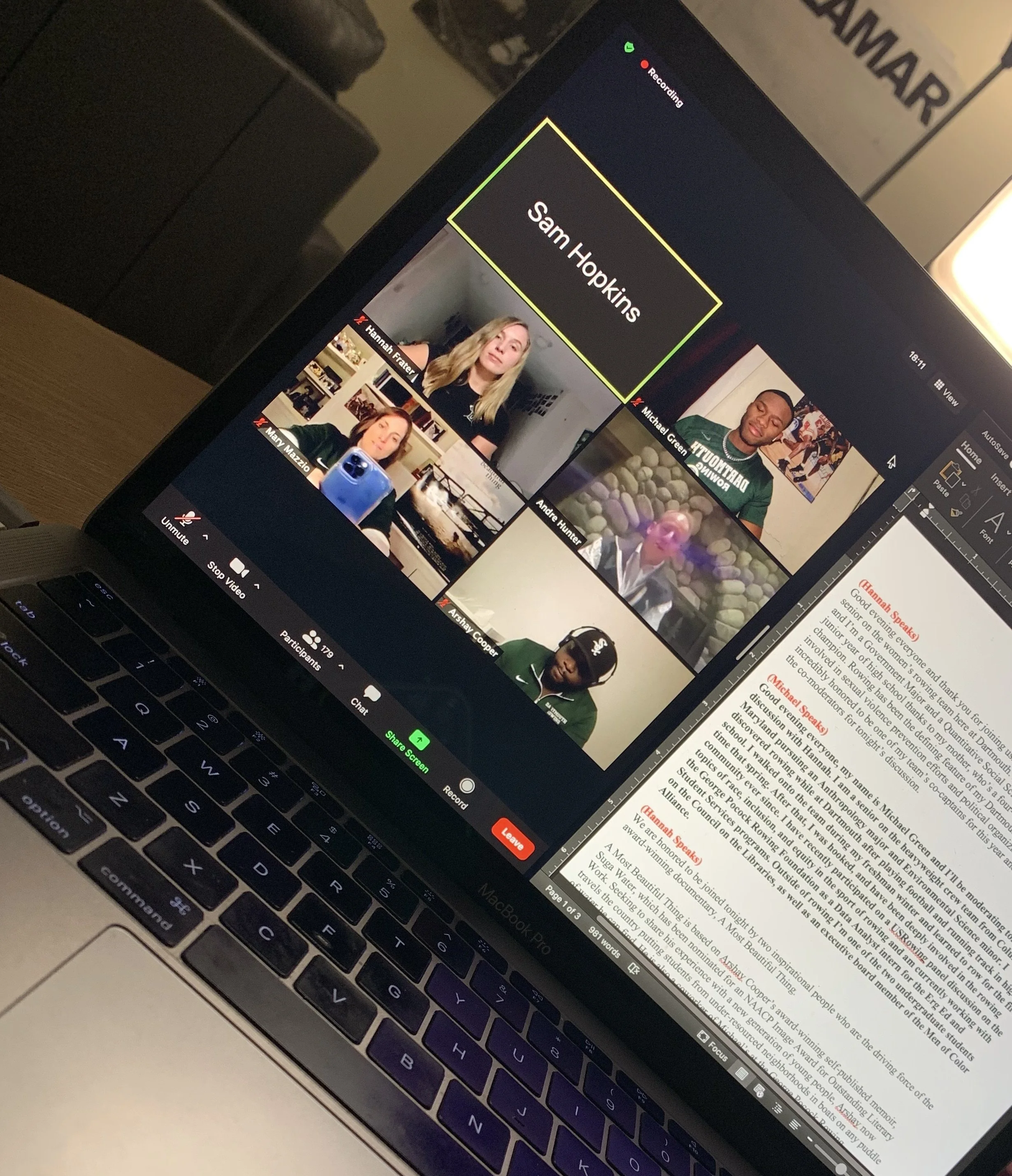 “Big Green rowers Michael Green '21 and Hannah Frater '21 moderating a panel discussion of the film "A Most Beautiful Thing" with director Mary Mazzio and creator Arshay Cooper.”